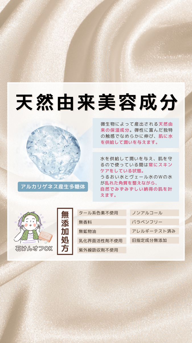 アルカリゲネス産生多糖体により、 メイクをしながら肌に水分を与えます。